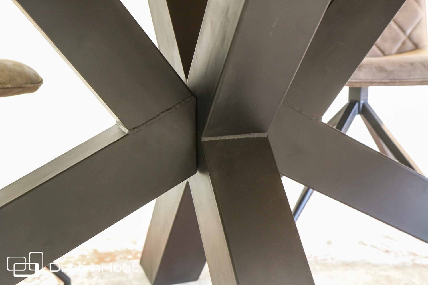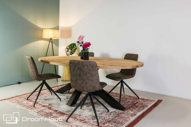 De lamellen van het ovale massieve eikenblad zijn mooi doorlopend en voelen lekker robuust aan. De vezels van het hout zijn duidelijk zichtbaar wat deze tafel Andros een toffe look geeft. De rand van de Andros is opgedikt, hierdoor krijgt de tafel een mooie dikke uitstraling, maar valt het gewicht mee. De matrix kruispoot is gemaakt van industrieel staal wat zwart gepoedercoat is. De diameter van de koker is 10 x 10 cm, dat geeft een lekkere robuuste look dus.